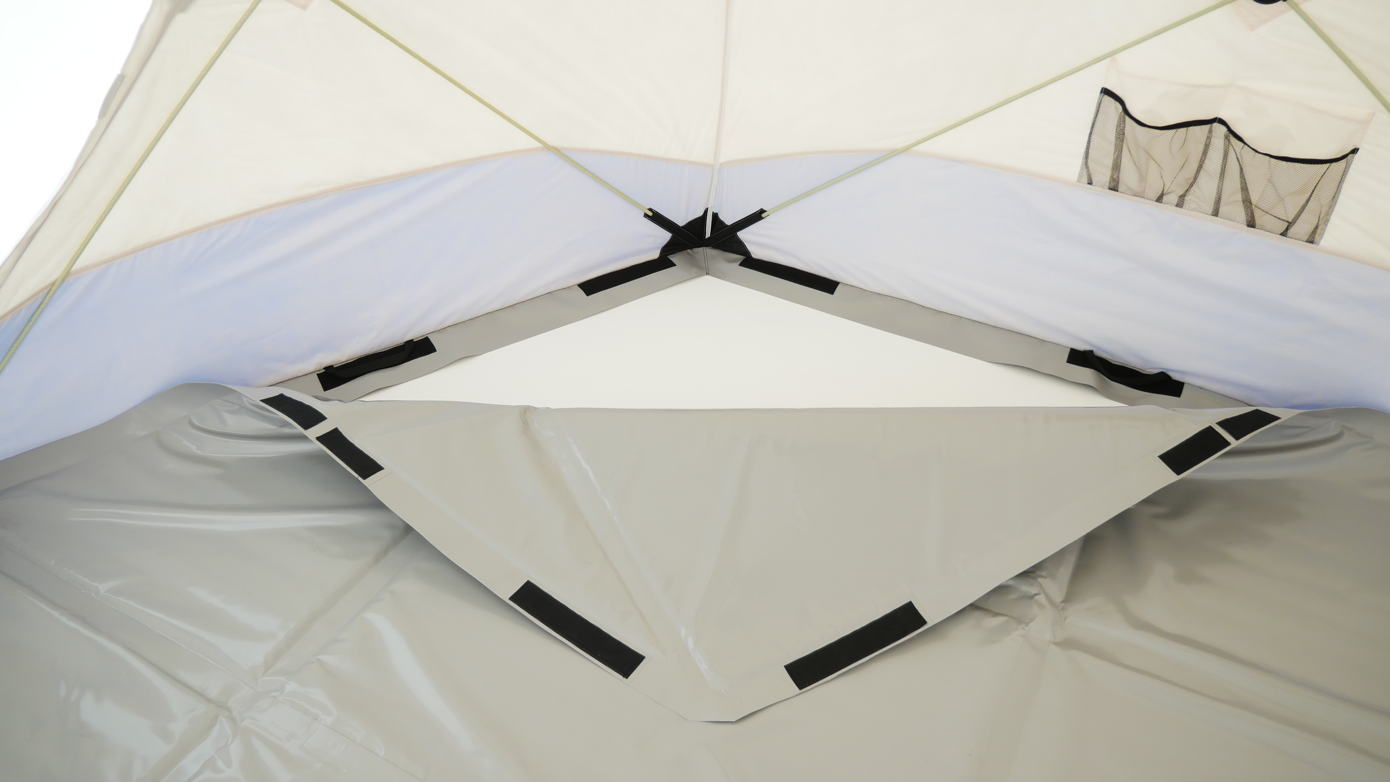 На одной из сторон палатки есть отверстие с клапаном и вставкой из негорючего материала для выхода трубы автономного обогревателя.